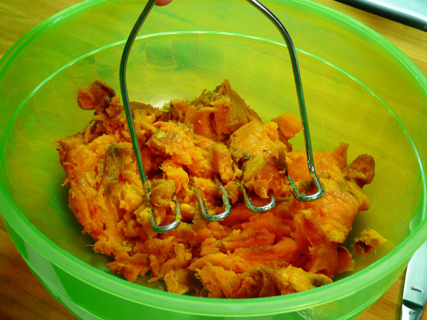 Grab your potato masher, or something similar, and mash the potatoes. Don’t have a potato masher? Just mash them with a couple of forks, working out any lumps. We’ll work them up some more later when we use the hand mixer.