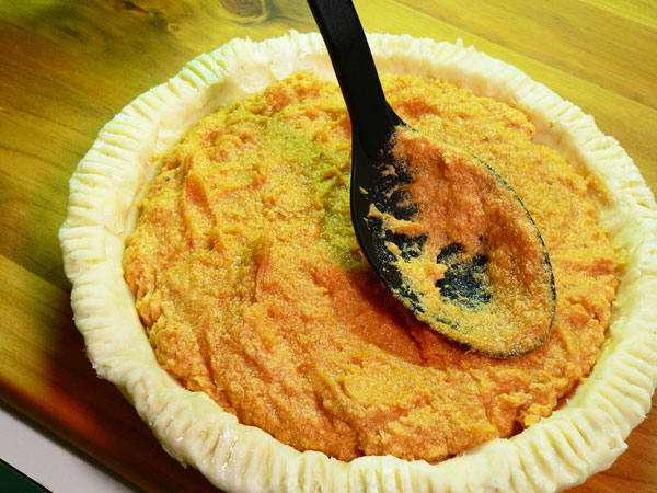 Spoon the pie filling into the crust. This filling is a bit thick as you can see. I could have added a bit more milk to thin it down some, but opted to not do it, and just stick to Aunt Bessie’s recipe.