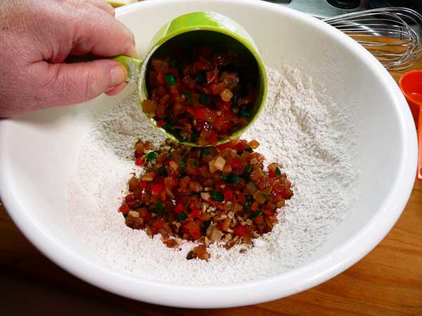 Add the fruitcake mix. This is usually available in grocery stores around the holidays. It’s the glazed fruit pieces but finely chopped. I added one cup, but the batter would easily hold two cups if you wanted more. Smile.