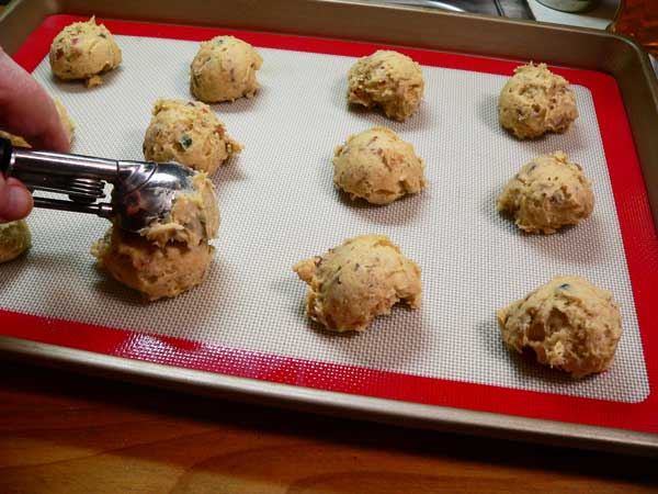 Line a baking sheet with parchment paper or a silpat like I’m using here. Scoop the dough out onto the baking sheet being sure you space them a couple of inches apart. I’m using a regular ice cream scoop for my first batch. It’s about a 2 inch scoop and makes a cookie that is about 4 inches in diameter. The dough will spread a lot once it gets in the oven, so leave as much space as you can.
