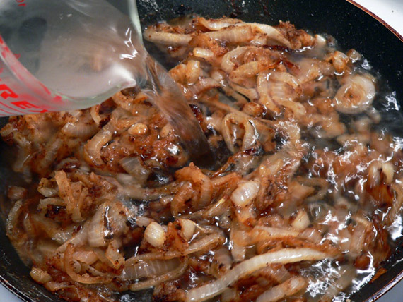 Place your sliced onions in the pan, right on top of all those browned bits. Reduce the heat just a little, and let the onions slowly cook until they are clear and caramelized. Don’t rush them. Let them cook low and slow, stirring occasionally, until they turn nice and brown in color. This step may take 20 minutes or longer, but its well worth the time. If they cook too fast, they will burn, and you don’t want that to happen.