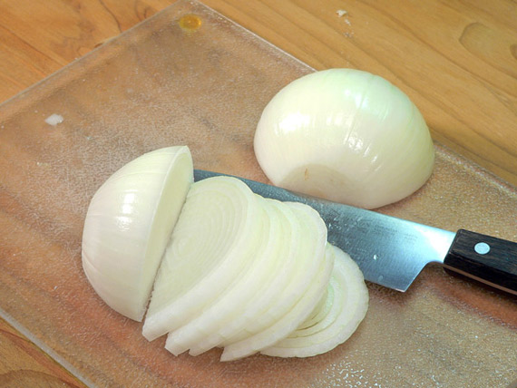 While the patties are cooking, let’s get started on the onions. Begin by slicing a whole onion in half and removing the outer skin.