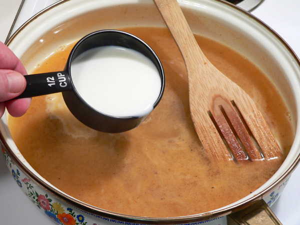 NOTE: There are numerous possibilites for making the gravy. I could have just added two cups of milk and two teaspoons of chicken granules and omitted the water. That would make a somewhat creamier gravy if that’s what you’d like to have. This gravy recipe is just a little thinner.