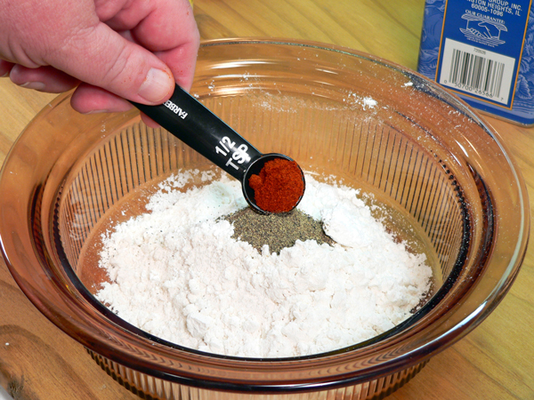 We’ll begin by making a breader for our pork chops. Using a medium sized mixing bowl or similar container, add one cup of flour. Just use what you have available, self-rising, or all-purpose.