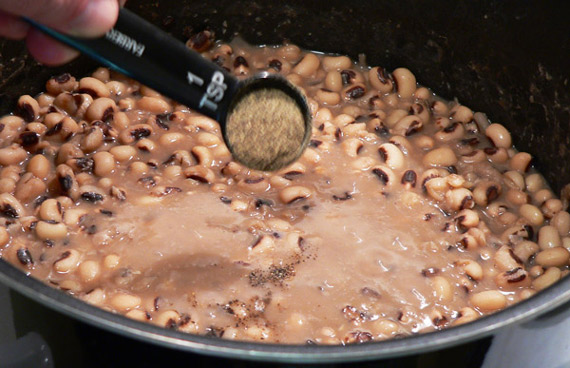 (Note: If you’re using bacon grease instead of a piece of pork, now would be a good time to add it after the peas have cooked some.)