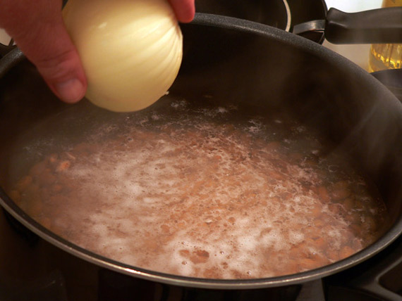 Once the beans reach a slight boil, drop in the whole, peeled, Onion.