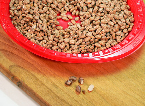 Spread your dry pinto beans out in a large plate, pan, or on your counter top to sort through them. The beans are harvested mechanically and haven’t been washed. You’ll want to look through them for small stones, sticks, hard beans, or other foreign matter prior to cooking. Remove any bad things you find and throw them away.