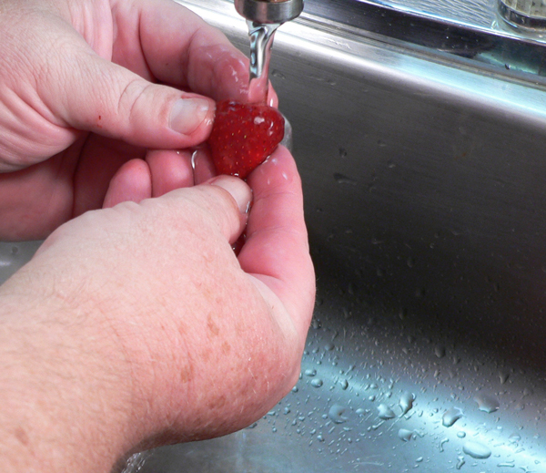 Now, you want to wash the berries to remove any leftover stems, pieces of caps and any dirt that might be on them. Yes, I wash each berry one at a time under lightly running cool water. It’s really quicker than you think and, that way, you know each berry is good and squeaky clean.