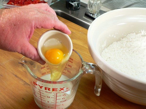 After you whisk the egg and milk together, form a small well in the flour and pour the milk mixture in.