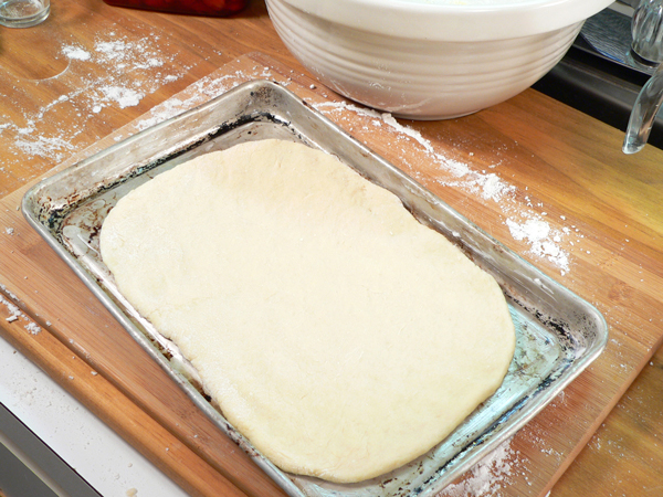 Carefully lift the rolled out dough from the counter top and place it in the greased pan. It didn’t reach the sides and I didn’t expect it too. It adds to the final presentation by it not being pressed into the pan to fit. A flat cookie sheet would have worked just as well but, I grabbed what was nearest at hand.