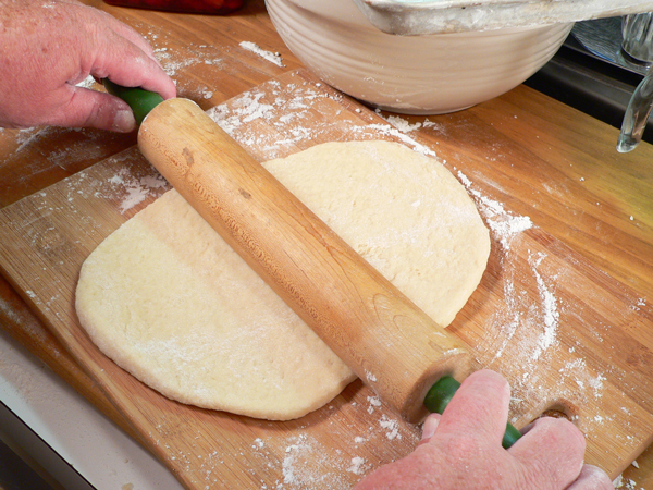 After you’ve worked all the dough together until it’s smooth, shape it into a ball and place it on the board. Gently pat it out into a circle. When working with the dough, if it’s too sticky, just add a little more flour on top and keep working it until it’s not sticking all over your fingers. I know it really needs a little more explanation if you’re a beginner. But, just refer back to the pictures if possible and work your dough until it looks similar.