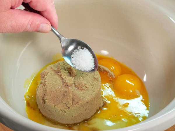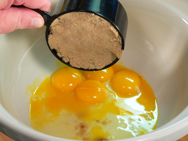 Place the Egg yolks in a large mixing bowl and then add in the cup of packed Brown Sugar.
