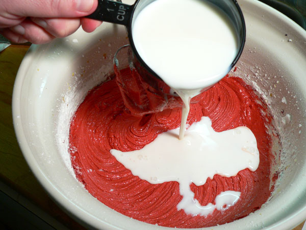 If you try to just stir this, I think you could be stirring all day long and, into the night. It’s amazing how well the Cocoa Powder can just float on top of Red Food Color. If you make the paste separate, be sure to kind of scoop from the bottom of the bowl up to the top as you stir. This helps make the paste much quicker than just stirring alone. The recipe called for making a paste of these two ingredients. I wanted to stay true to the recipe but, lots of other recipes mix it into the batter differently. You could add the Cocoa into the flour and the Red Food Color into the wet ingredients. Its also a bit hard to get it all out of the bowl this way. Just saying.