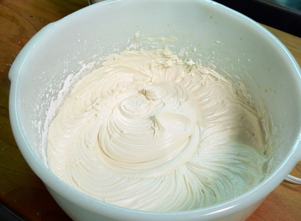 Mix it until it gets to a very smooth consistency, thin enough for spreading, firm enough to hold a bit of shape. It’s very sweet. There may be a finger indentation in there somewhere if you look closely. Where might that have come from I wonder.