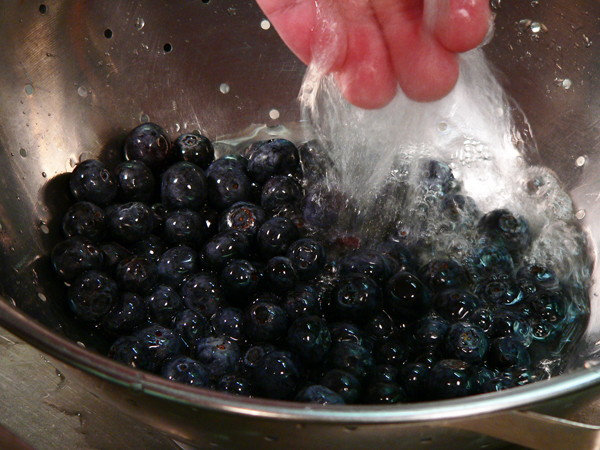 We’ll begin with the prep for our berries. Place about one cup of Blueberries in a colander. Sort through them and remove any bad berries you might find. Also, remove any stems or other items that might have been attached.