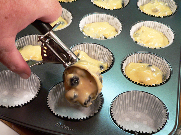Of course, you could also just grease the openings and then add the batter. It’s your choice. I also like to use my Ice Cream scoop to add the batter to the cups. Only problem is, I’m trying to use it with my left hand here and it wasn’t working too well. I’m right handed and was using the right hand to take the picture. Fill each cup about 3/4ths full with the batter. I opted to go ahead and fill all 12 cups. It wasn’t actually enough batter to do that many and they ended up being on the small side. Nine would have probably worked out better and made a little larger muffin in the long run.