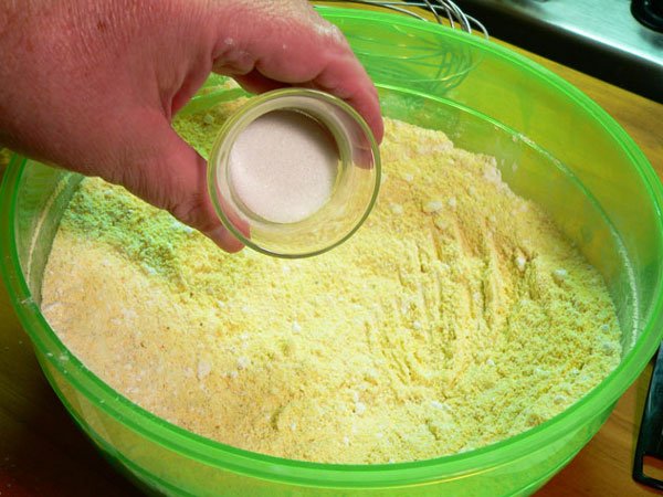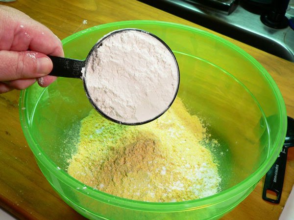 Place the cornmeal in a medium sized mixing bowl. You’ll also want to go ahead and preheat your oven to 425º.