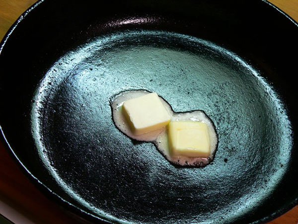 Place the skillet over medium heat on your stove top. Once the pan has started to warm up, add a couple of pats of butter and let it melt.