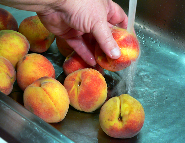 Lightly rinse the peaches under cold running water to remove any dirt of fuzz.