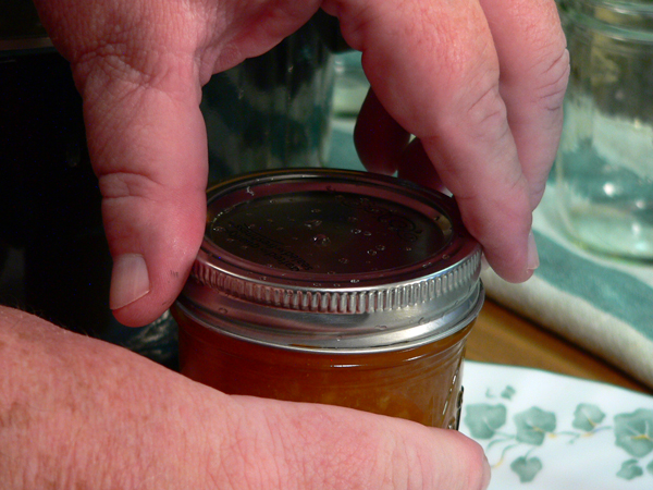 Finger tight. All the canning recipes say to tighten the band down just finger tight. That means, just snug it down to the top without using any extra force. Don’t give it all you’ve got to get it tight. Just a gentle snug down and it’s good to go.