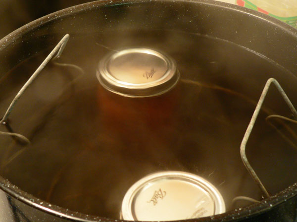 Use some oven mitts or, as I do, some tongs and, lower the entire rack into the canner. The jars need to be under at least one inch of water. This is why I keep extra water heating up on my back burner. After I’ve sterilized my jars, the water level has dropped. I can use that hot water to quickly get the water back to a rolling boil inside the canner.