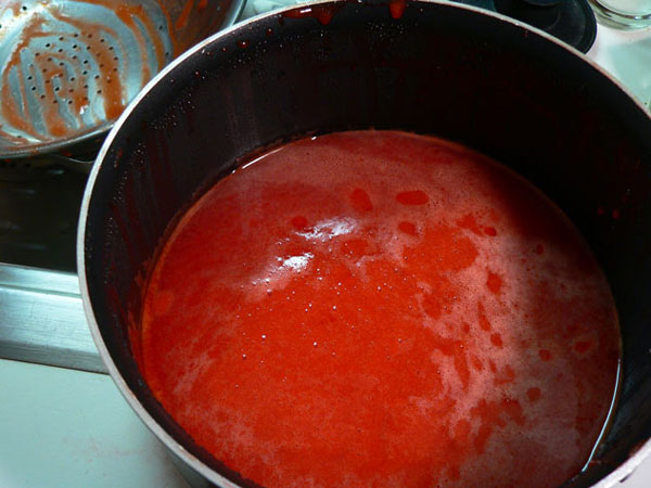 You’ll need to measure the amount of juice you get from the Strawberries. Regular season berries will probably yield more juice because the berries are allowed to ripen a bit more on the vine before they’re picked. I had acquired three cups of juice from three pints of Strawberries. It was a little less than I had expected, but the great thing about this type of recipe is that its pretty adjustable. You just need to know how much juice you have before you start adding sugar. Measure it carefully, make note of how much you have, then set the juice aside while you prepare the jars.