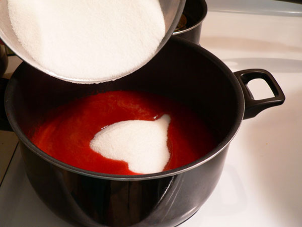 Now, measure out the amount of sugar you’ll need to make the Strawberry Syrup. This particular recipe will allow you to adjust the amount of sugar used depending on whether you want regular syrup or one with less sugar. The printed recipe includes a standard measurement for 4-1/2 to 5 cups of juice. Since I only had 3 cups of juice, I’m having to adjust the recipe to fit. I’m going with a ratio of one cup sugar to one cup juice plus 1/2 cup more sugar. I could cut the amount of sugar used in half if desired and still get a favorable result. All recipes are not this flexible, so keep that in mind if you’re just beginning to preserve foods at home.