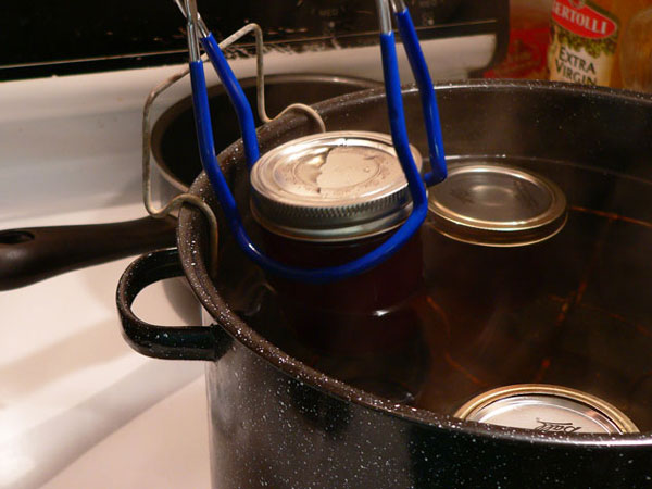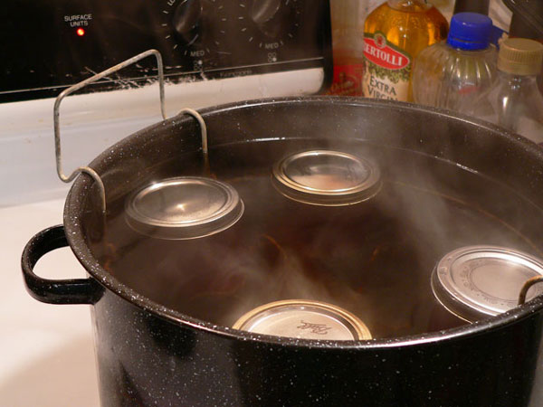 When the water comes back up to a boil, cover the canning pot with its lid. Start timing the water bath process at this point.