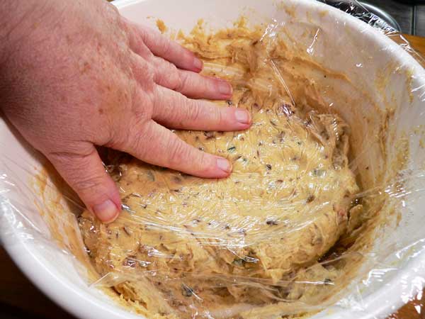Tear off a piece of plastic wrap and place it right down on top of the dough in the bowl. Press the wrap against the sides of the bowl to seal it in. And, don’t be like me, scrape down the bowl and be sure you have all the dough mixed in together. I’m not sure why I missed that part. Smile.