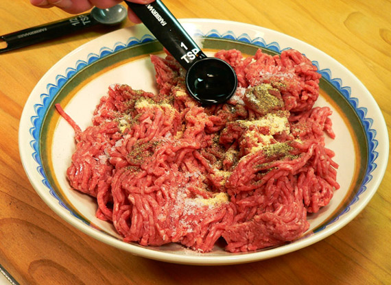 Here are the ingredients you’ll need. I’m using Ground Beef Round in an 80/15 mixture. I’m showing a two pound package in the photo, but I’m only using half of that in the recipe which will give me four servings.