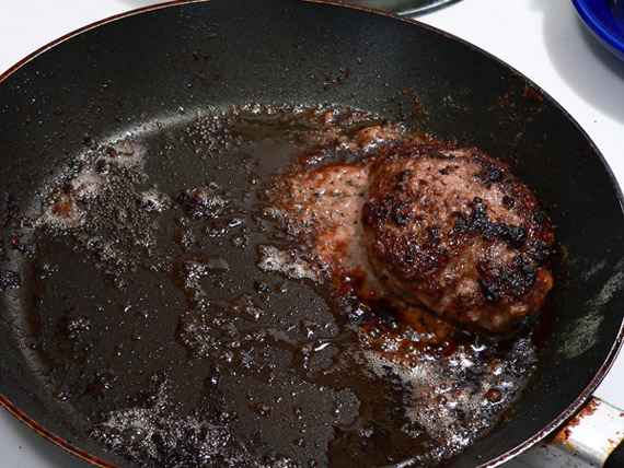 Even with only a 15 percent fat content, the patties will shrink. After I’d turned all three, I had enough room to add my fourth patty. You just need to watch the first ones and don’t let them burn. Take them out when they have browned completely on both sides.