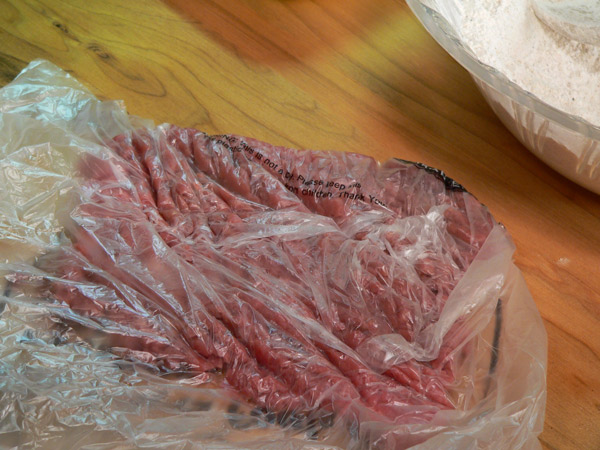 Place a piece of the cubed steak in a plastic bag or between two layers of plastic wrap. I’m using one of those really thin bags you find in the produce section of the grocery store to put your tomatoes etc. in. They come in really handy sometimes so I hardly ever throw them away if they’re still clean. They’re perfect to pound out the cubed steak for this recipe.