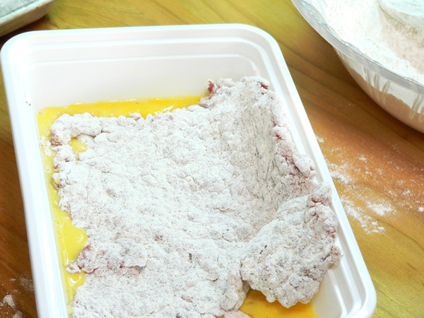 Next, place the flour coated steak section in the egg wash. See how flat we got that. My little egg wash pan was almost too small.