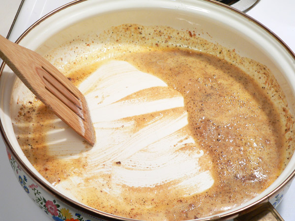 Reduce the heat of your pan to medium-low. Cubed steak doesn’t normally have enough fat to mention. You’ll need about 2-3 Tablespoons of oil in the pan. If you don’t have this much after frying all the pieces, add a little more oil to the pan drippings. It’s time to make some gravy.