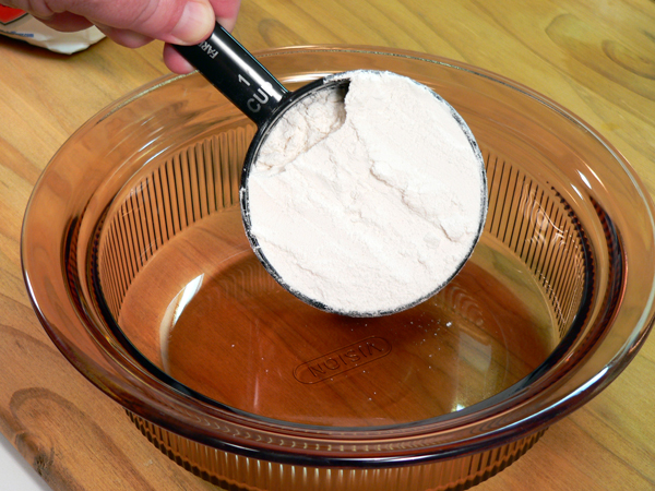 We’ll begin by making a breader for our pork chops. Using a medium sized mixing bowl or similar container, add one cup of flour. Just use what you have available, self-rising, or all-purpose.