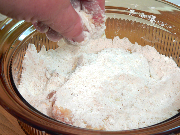 Flour both sides of the pork chop, making sure to coat all around the edges. Oooops….looks like I forgot which hand was the wet one and which was the dry one. Flip the chop over and make sure you coat both sides completely with the seasoned breader.
