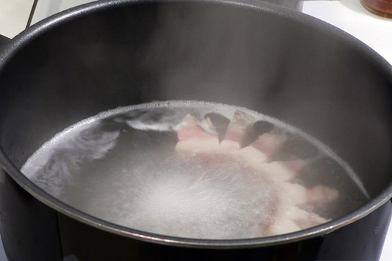 After the pork has cooked for about 30 minutes, carefully add the peas into the pot. That’s hot water so don’t splash yourself.