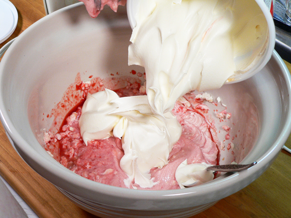 Pull the container of Cool Whip out of the refrigerator and dump it all into the bowl.