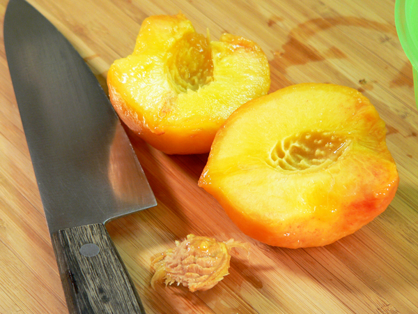 We don’t have the “Freestone” peach variety available just yet. These are some of the very first peaches of the season and with this variety, the pits were a bit more difficult to remove in a couple of them. The Freestone variety has a pit that will pretty much pop right out after you cut it. Also, these weren’t as ripe as I’d preferred which made them a bit on the firm side.