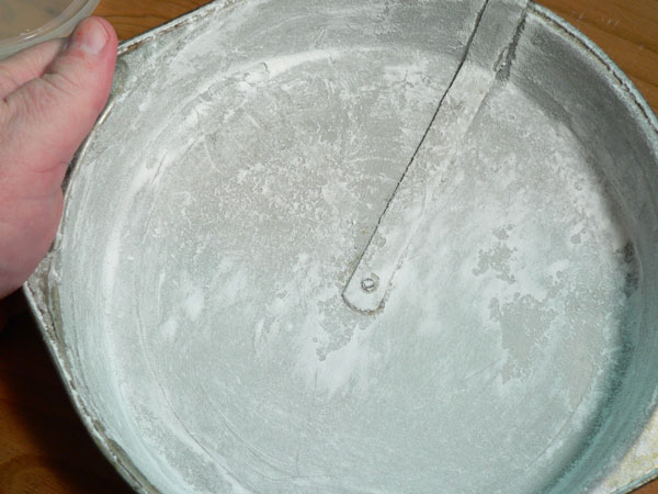 You should still have some leftover flour from the first time you sifted it. Dump a good handful of that into your baking pan and shake it all around to coat the bottom really good.