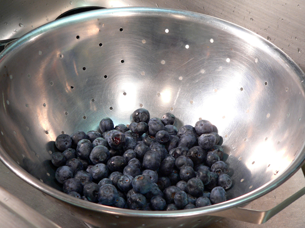 We’ll begin with the prep for our berries. Place about one cup of Blueberries in a colander. Sort through them and remove any bad berries you might find. Also, remove any stems or other items that might have been attached.