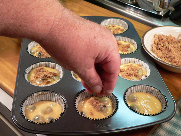 Use your fingers and add a little of the Crumb Topping mixture to each of the cups. I went a little sparingly with mine and had a bunch of topping mix leftover. Too much of the topping can cause the tops to be a bit soggy so use it sparingly.