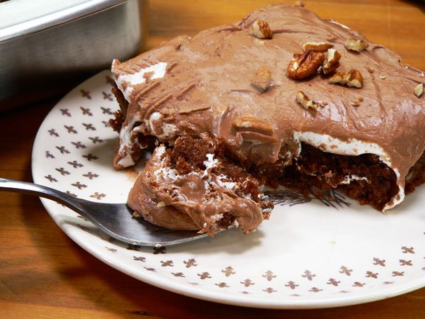 This sheet cake is perfect for any chocolate lover. Gooey brownie like cake layer with pecans, topped with Marshmallow Creme and a layer of Chocolate frosting. What’s not to love about that?