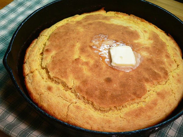 Place the skillet on a wire rack, or folded towel, and let the cornbread cool for a few minutes before serving. Some melted butter spread across the top just adds another good layer of flavor.