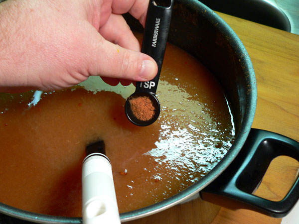 Add the Ground Allspice and the Ground Cloves or, in my case, I’m adding the spice bag I made. I’ll take it out once it’s cooked down.