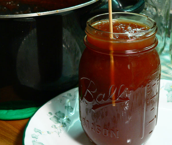Before I got too far along, I placed a saucer in the freezer part of my refrigerator. This is used to test the consistency of the Apple Butter and also is used as a way to test most jellies, jams and preserves. Remove the saucer from the freezer, add a spoonful of the apple butter then, swipe your finger through it. If it leaves a trail and doesn’t run back together, it’s a pretty sure bet that your butter is ready. You can also see a little runoff of water from the butter towards the bottom of the photo. It’s thick enough but needs to cook just a few minutes longer I think. If you over cook it though, it will become like plastic inside the jar and doesn’t turn out to be a very good spreadable butter.