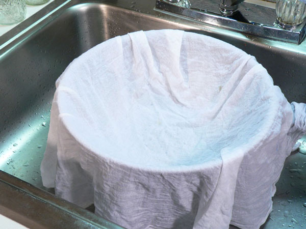 A couple of layers of cheesecloth will work great, or just use a clean white cloth. This is a flour sack dish towel that I’m using. It’s draped over the colander and the sauce pot. The mesh of the cloth is a bit tight, but it will catch all of the seeds from the berries.